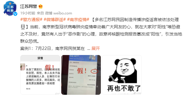 案例2:常州网民杜某某、杨某某系普通朋友。7月23日,杜某某将杨某某的核酸检测报告截图,使用P图软件将“阴性”修改成“阳性”,然后发送给杨某某。随后,杨某某又将该图片发布至微信群中,后被他人拍摄成短视频传播。目前,杜、杨二人已被属地公安机关依法行政拘留。