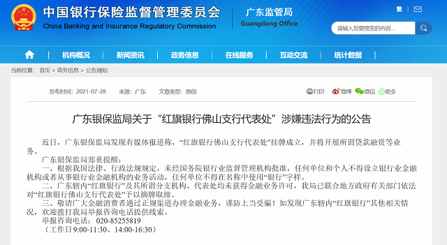 7月28日,广东银保监局提醒,广东辖内“红旗银行”及其所谓分支机构、代表处均未获得金融业务许可,广东银保监局已联合地方政府有关部门依法对“红旗银行佛山支行代表处”予以摘牌取缔。