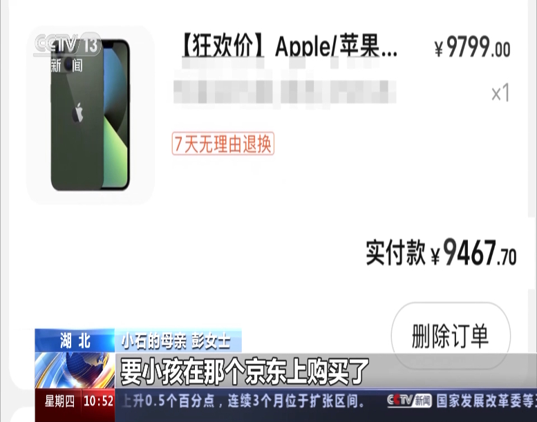 小石的母亲 彭女士:要小孩在那个京东上购买了一共是11部苹果手机,每一部大概是9000多块,将近10万块,后面又通过微信给银行转账,转走了28000块。