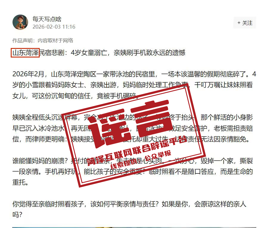 近日,有网民在某平台发布“2026年2月,山东菏泽定陶区一民宿内,亲姨刷手机致使4岁女童在泳池内溺亡”等相关信息。...