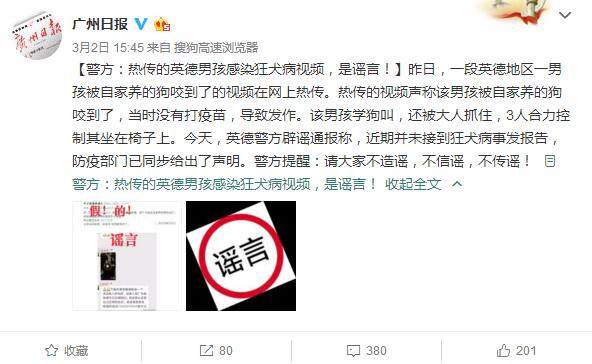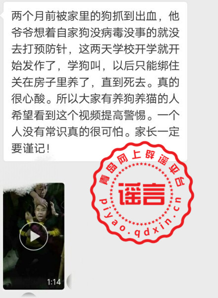 信网3月7日讯 近日,一段“英德地区一小男孩被自家养的狗咬到了,狂犬病发作狰狞学狗叫”的视频在微博、微信和朋友圈里疯传。