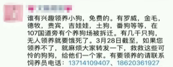 信网3月29日讯 最近,在山东人的朋友圈您可能会看到这样一个内容:“在107国道旁有个养狗场被拆迁。有几千只狗,无人领养就要饿死了。3月28日截至,如果您领养不了,就麻烦大家转发一下……”后面还备注了联系人的电话。