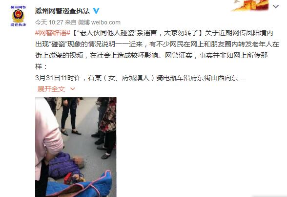 4月3日,安徽省滁州市公安局网络安全保卫支队官方微博@滁州网警巡查执法发布关于近期网传凤阳境内出现“碰瓷”现象的情况说明: