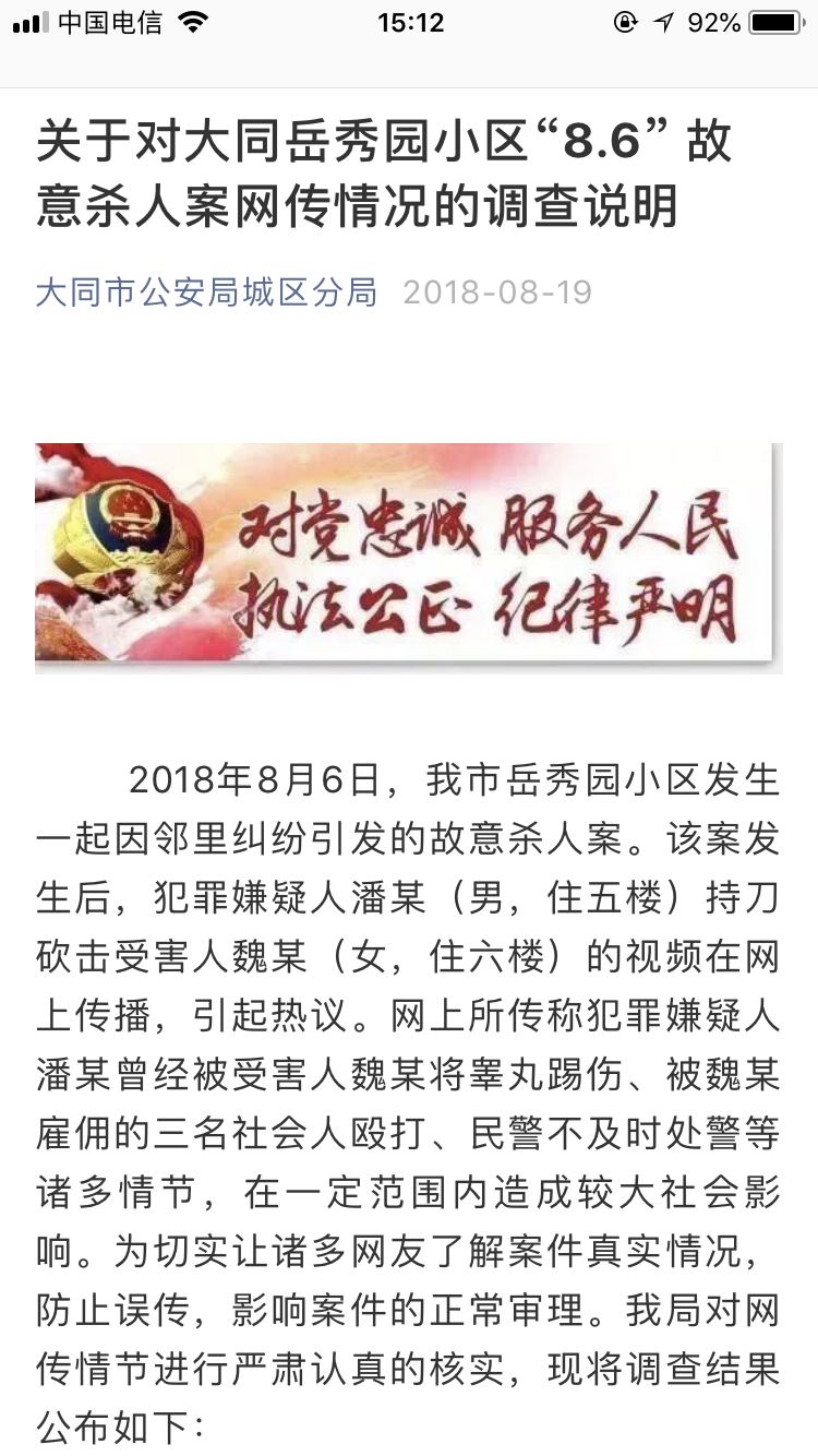 事实上,早在8月7日山西省大同市公安局警察公共关系科就通过其官方微博发布了关于大同市平城区岳秀园小区发生一起故意伤害致死案的情况通报,通报称,2018年8月6日上午9时30分左右,大同市平城区岳秀园小区发生一起故意伤害致死案。受害人魏某(女,1970年出生,无业)与嫌疑人潘某(男,1992年出生,无业)系该小区一号楼邻居,因邻里纠纷曾发生过矛盾,嫌疑人潘某对受害人魏某怀恨在心。案发当日上午,两人再次发生口角,潘某随即返回家中取出菜刀欲报复魏某,在一号楼下找到受害人后,将其连续砍击致伤。受害人魏某被送至医院,经抢救无效死亡。现该案嫌疑人潘某已投案并被警方控制,该案正在进一步审理中。