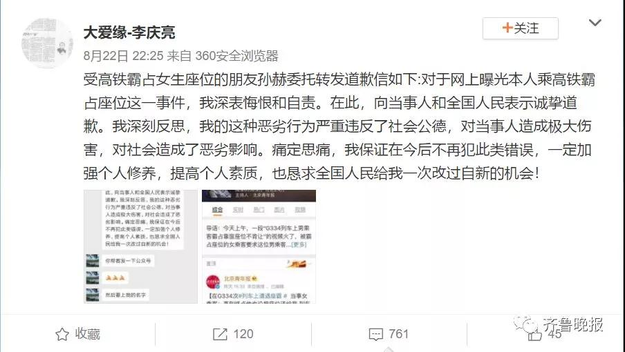 事件发酵之后,引发了网友的关注和热议,8月22日晚当事男子孙先生也终于回应了,“对于网上曝光本人乘高铁霸占座位这一事件,我深表悔恨和自责。在此,我向当事人和全国人民表示诚挚道歉,我深刻反思,我的这种行为严重违反了社会公德,对当事人造成了极大伤害,对社会造成了恶劣影响。痛定思痛,我保证在今后不再犯此类错误,一定加强个人修养,提高个人素质,也恳请全国人民给我一次改过自新的机会。”