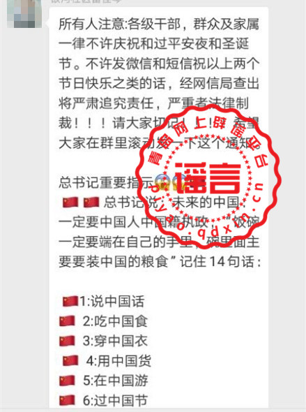在人们沉浸在精心布置的节日氛围中时,一则“不许庆祝过平安夜和圣诞节”的消息却在网络上不胫而走。消息称:“转发通知:各群一律不许发庆祝过平安夜和圣诞节的各种微信和短信。经网信局查出将严肃追责,请大家切记!”