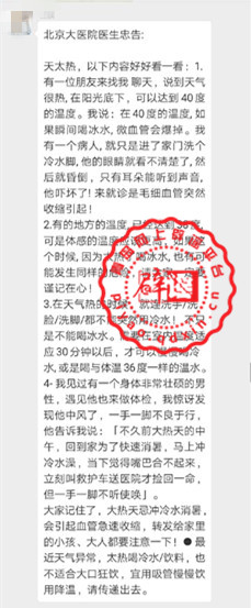 信网6月12讯 虽然目前全国处在初夏模式,距离三伏的初伏也还有近一个月的时间,不过,近日,一条“组合忠告”在不少人的社交圈内流传开来。流言称:“1.40°的天气瞬间喝冰水微血管会爆掉;2.天热的时候洗手洗脸洗脚不能突然用冷水;3.男子大热天因快速消暑马上冲冷水澡中风......”