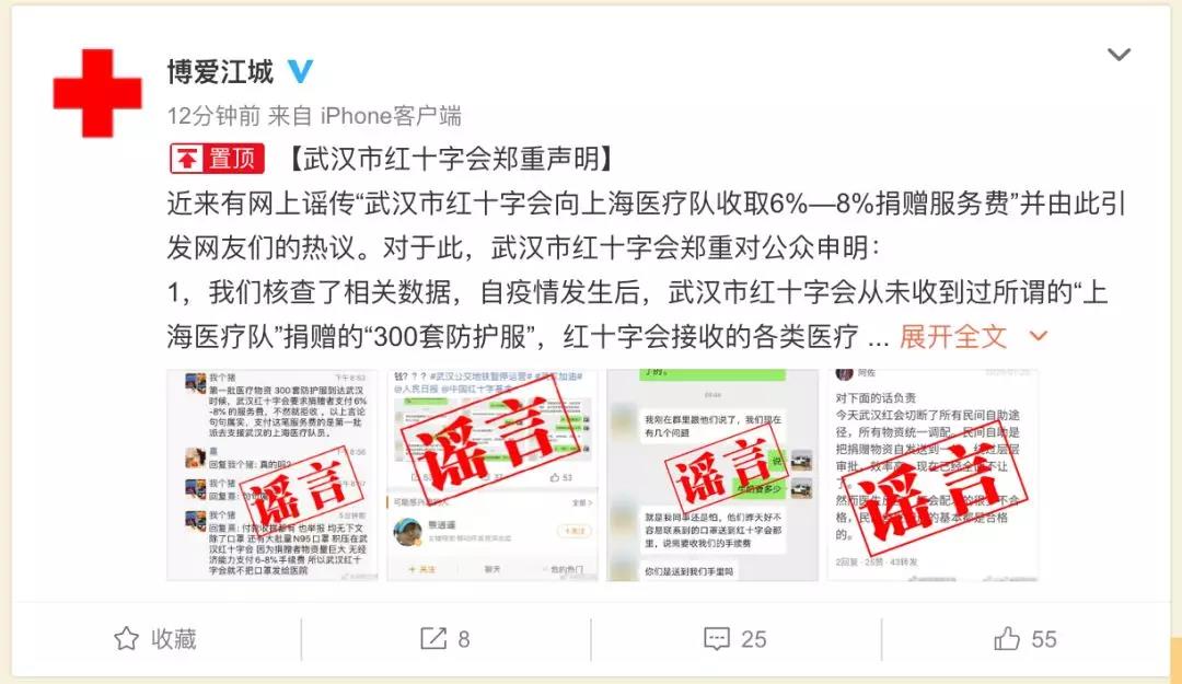 武汉市红十字会呼吁广大网友,不要让谣言玷污了各界爱心企业和爱心人士的善意之举,疫情面前,不信谣、不传谣,众志成城,共渡难关。