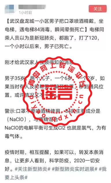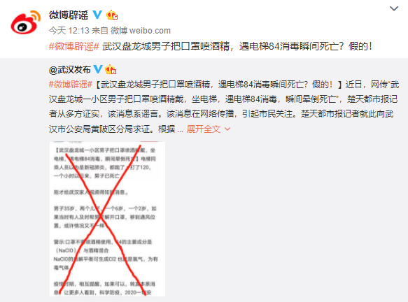 信网2月13日讯 近日,一则“武汉盘龙城一小区男子把口罩喷酒精戴,坐电梯,遇电梯84消毒,瞬间晕倒死亡”的消息在网络传播,正值新冠肺炎疫情防控关键时期,使用酒精和84也作为不少人居家常备消毒措施,安全问题自然引起市民广泛关注。