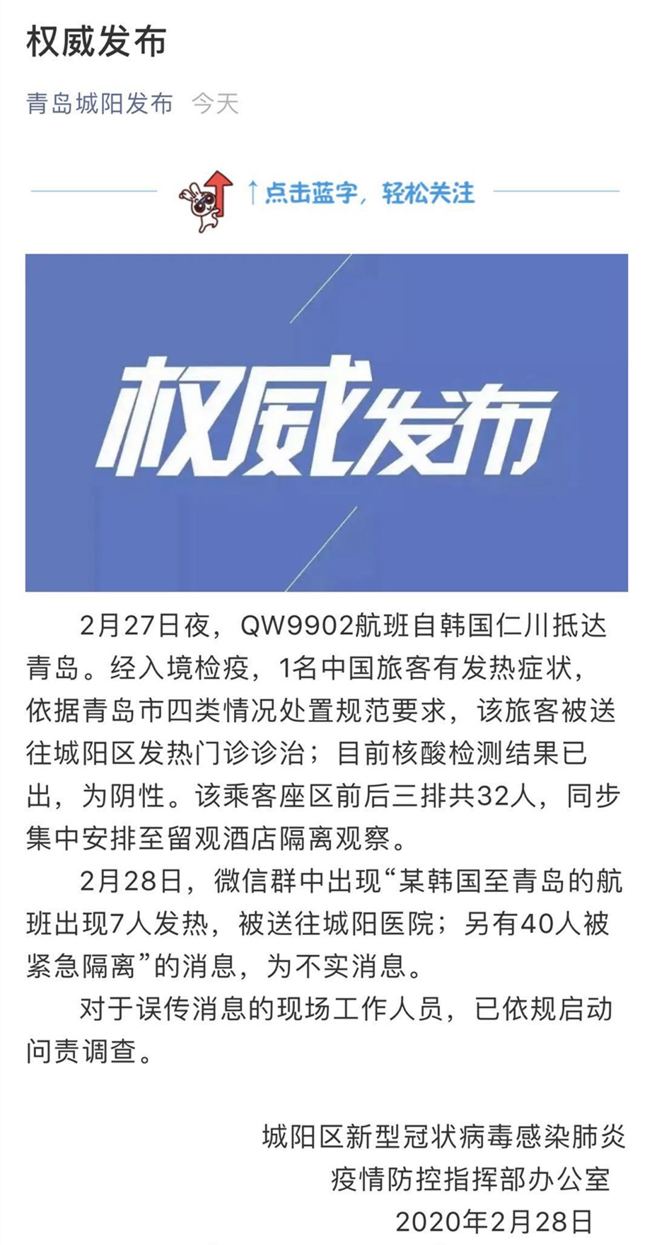 刚刚,城阳区新冠肺炎疫情防控指挥部办公室发布情况说明:2月27日夜,QW9902航班自韩国仁川抵达青岛。经入境检疫,1名中国旅客有发热症状,依据青岛市四类情况处置规范要求,该旅客被送往城阳区发热门诊诊治;目前核酸检测结果已出,为阴性。该乘客座区前后三排共32人,同步集中安排至留观酒店隔离观察。