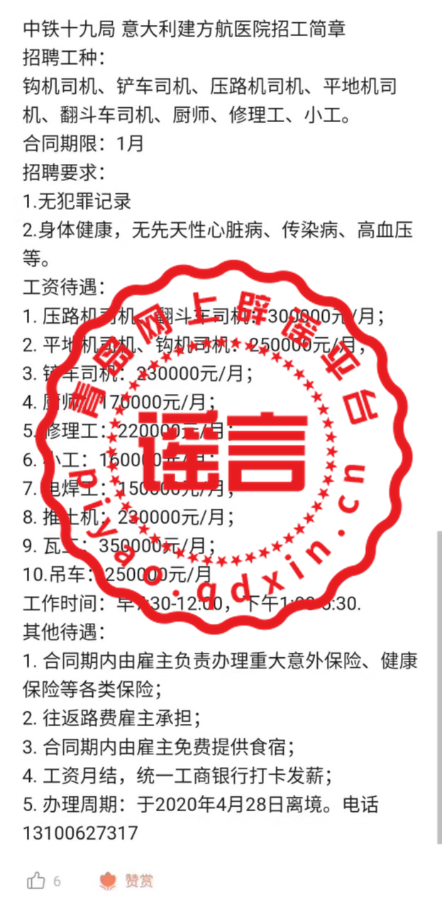 信网3月24日讯 近日,网上疯传一则“中铁十九局意大利建方舱医院招工简章”,简章中称,合同期限1个月,工资待遇最高的为瓦工每月35万,最低的电焊工月工资也在16万。