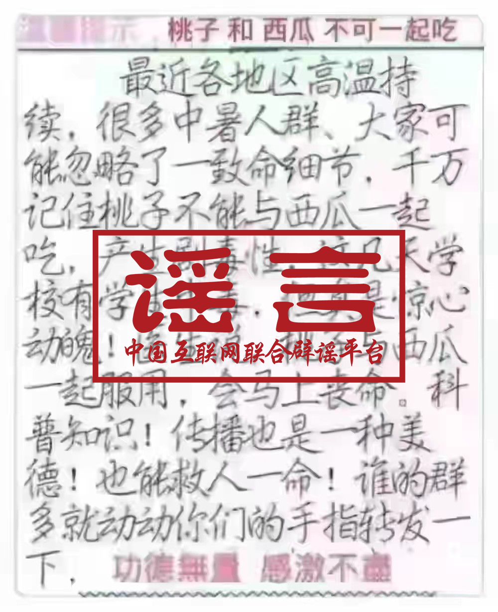 随着夏季到来,西瓜上市,一则陈年旧谣又开始在网上流传。谣言称,西瓜和桃子一起吃会产生剧毒。