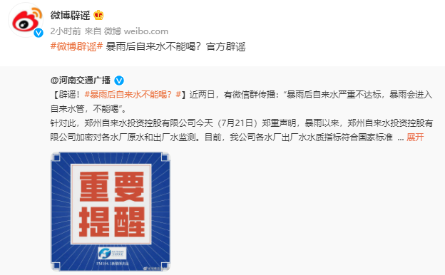 7月21日,郑州自来水投资控股有限公司郑重声明,暴雨以来,郑州自来水投资控股有限公司加密对各水厂原水和出厂水监测。目前,郑州自来水投资控股有限公司各水厂出厂水水质指标符合国家标准(GB5749-2006),不存在不达标情况,所以请居民放心使用。