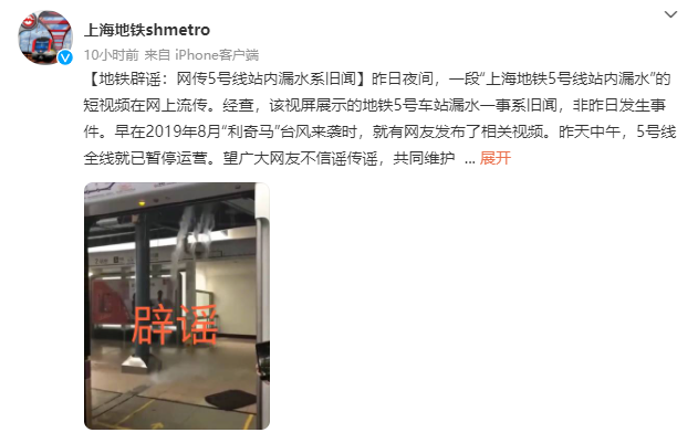 随后,上海地铁进行了辟谣,经查,该视屏展示的地铁5号车站漏水一事系旧闻,非25日发生事件。早在2019年8月“利奇马”台风来袭时,就有网友发布了相关视频。