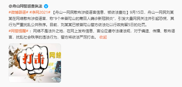 9月15日,舟山一网民刘某某在网络散布涉疫谣言,称“9个来普陀山的莆田人确诊新冠肺炎”,引发大量网民关注并引起恐慌,其行为严重扰乱公共秩序。目前,刘某某已被普陀山警方依法处以行政拘留5日的处罚。