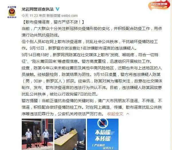 9月15日凌晨,警方将违法嫌疑人陈某(男,30岁,新罗区人)抓获。经审讯,陈某对其为博取关注,故意在社交媒体制作、发布、散布涉疫谣言的违法行为供认不讳。目前,违法嫌疑人陈某因故意扰乱公共秩序,被处以行政拘留7日的处罚。警方提醒:当前正值抗击疫情的关键时刻,请广大市民朋友不造谣、不传谣、不信谣,积极配合做好疫情防控工作。对在网上编造、传播、散布谣言扰乱公共秩序等违法犯罪行为,公安机关将依法严厉打击。