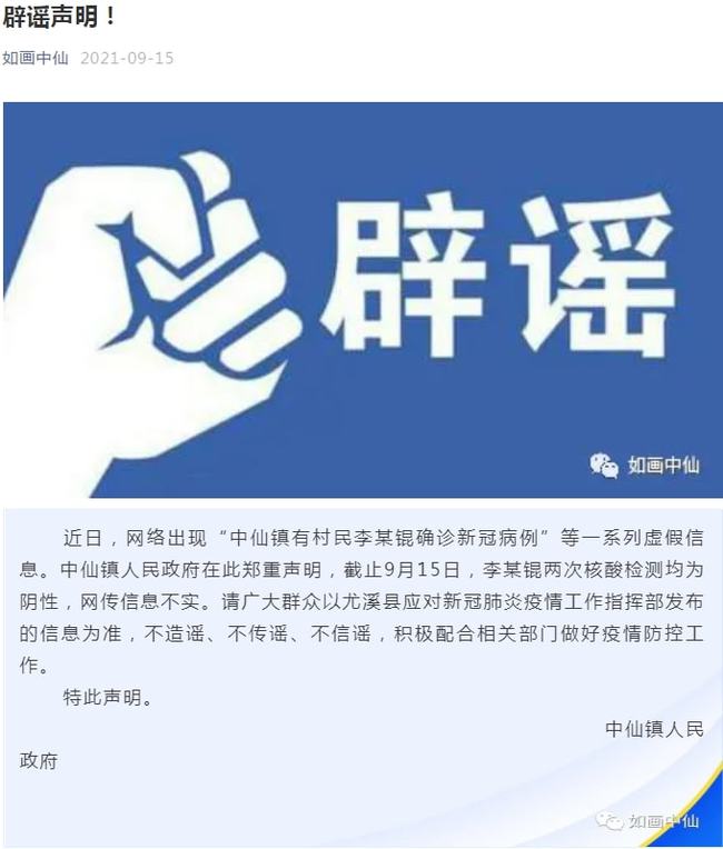 据中仙镇人民政府微信公众号消息,近日,网络出现“中仙镇有村民李某锟确诊新冠病例”等一系列虚假信息。中仙镇人民政府在此郑重声明,截止9月15日,李某锟两次核酸检测均为阴性,网传信息不实。请广大群众以尤溪县应对新冠肺炎疫情工作指挥部发布的信息为准,不造谣、不传谣、不信谣,积极配合相关部门做好疫情防控工作。