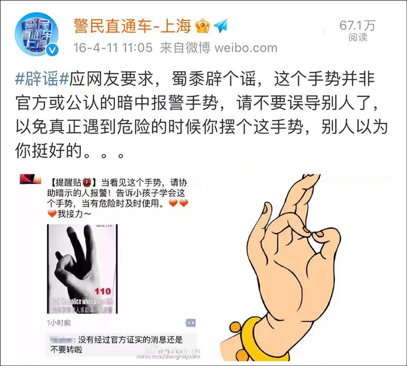 2016年就曾流行过一个所谓的“报警”用的“OK手势”,近年来全国各地公安机关已经对相关谣言进行过辟谣,同时提醒大家,遇到危险,受害人报警的时机很可能转瞬即逝,千万不要被误导。