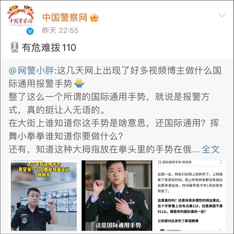 9月24日,沈阳网警巡查执法团队负责人微博@网警小胖 转发了相关帖子后无奈表示,“整了这么一个所谓的国际通用手势,就说是报警方式,真的挺让人无语的。普通网民不明就里跟风做这个,我们还可以理解,但是,警方账号也跟风做?是不是有些说不过去了!”