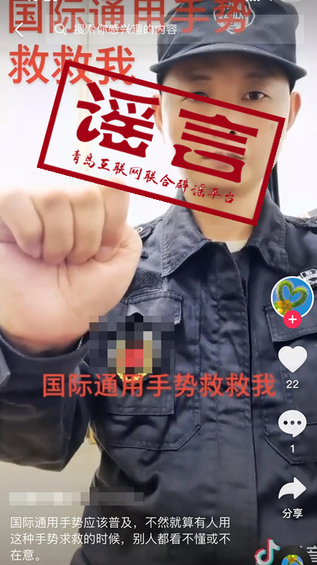 今年,这种谣言换了个“手势”再次在社交媒体上流传。网络谣言帖中,所谓的“国际通用报警求助手势”在博主拍摄各种“科普”小视频里,夹着着剧情被演绎得五花八门。“路人瞬间戳穿了坏人阴谋”、“外卖员立刻知道你处于危险之中”、“经过别人身边,合上手就可以‘报警’了”、“眨两下眼也是‘国际通用报警求助姿势’”、“敲桌子三长三短就可以报警了”等等奇葩桥段让不少人看了简直哭笑不得。