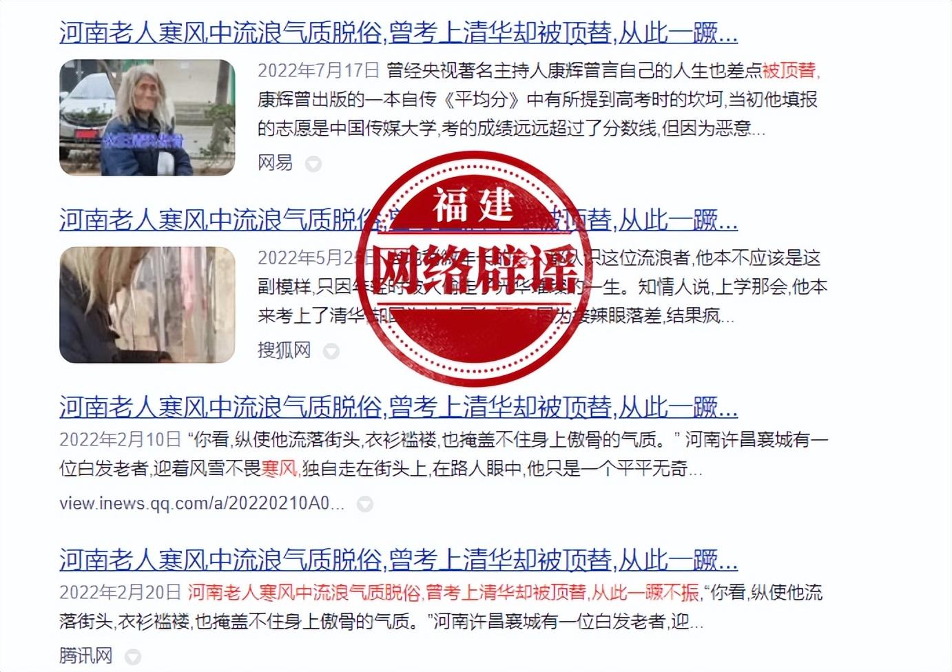 近日,网上传播着《河南老人寒风中流浪气质脱俗,曾考上清华却被顶替,从此一蹶不振》的文章。文章称:知情人说,上学那会,他本来考上了清华,却因为被人冒名顶替,因为接受不了落差,结果疯了,变得一蹶不振,整个人都黯然无光。如果没有“小偷”,现在的他一定是位德高望重的学者。“小偷”不仅偷走了成绩,更偷走了原本灿烂的一生。