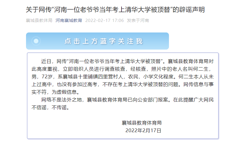 该消息2月份曾在网络上热传,2月17日,河南省襄城县教育体育局曾对此进行辟谣。河南省襄城县教育体育局回应:经核查,照片中的老人名叫何二生,从未上过高中,也没有参加过高考,不存在考上清华大学被顶替的问题。网传信息与事实不符,为虚假信息。
