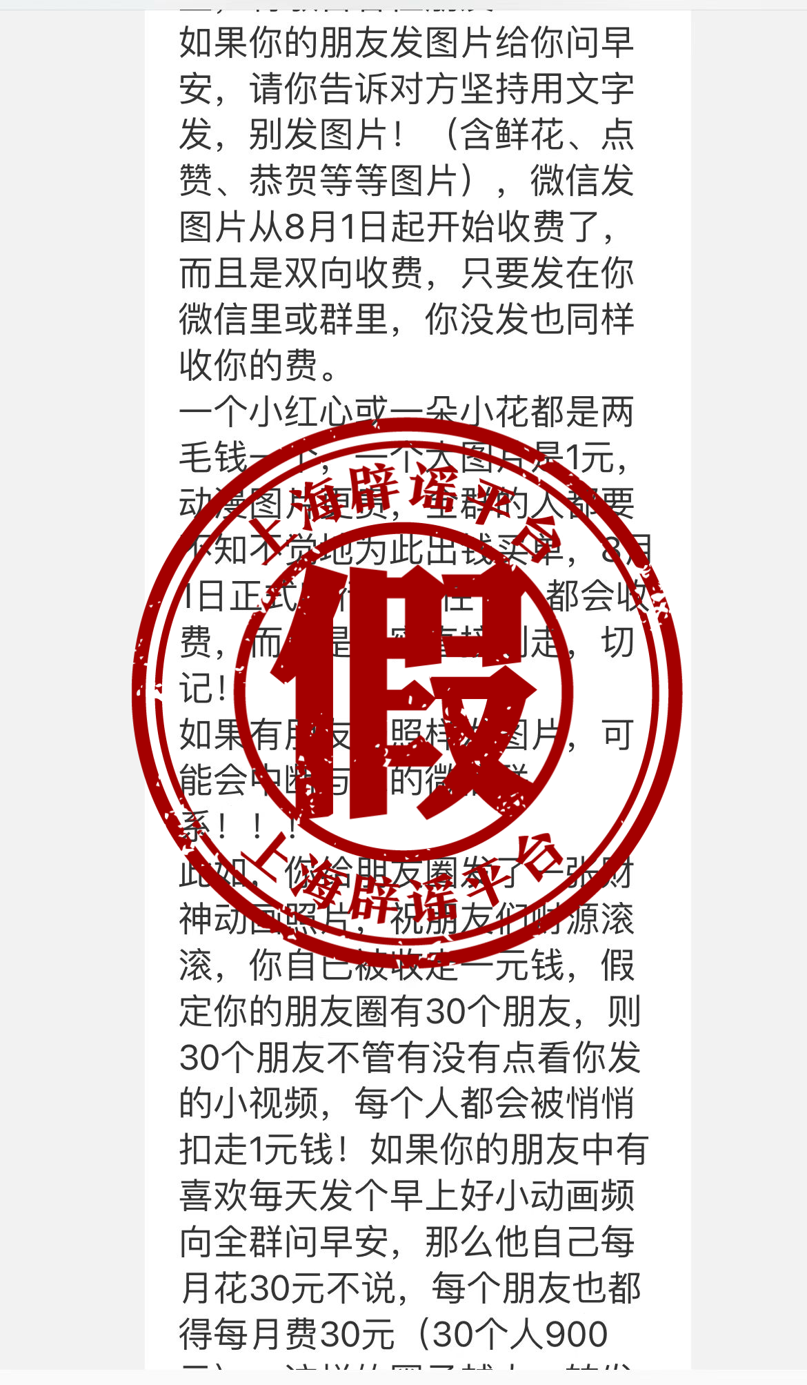 上海辟谣平台后台近日收到留言,希望求证“8月1日起微信发图片收费”的传言。经与微信方面确认,相关消息为谣言。查证梳理还发现,以“微信发图片要收费”为主题的谣言已经不是第一次出现,与之类似的还有“微信点赞要收费”等谣言。