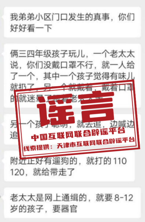 据“天津辟谣”微信公众号消息,接网民举报,网上出现11月13日天津“河北区金海道某小区门前有老太太拐骗儿童”的文字和视频等相关信息。