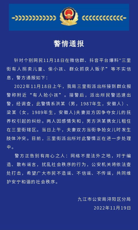 据“九江网警巡查执法”微信公众号消息,针对个别网民11月18日爆料“三里街有人拐卖儿童、偷小孩、群众抓获人贩子”等不实信息,江西九江警方通报称,经调查,此警情系洪某(男,1987年生,安徽人)、梁某(女,1989年生,安徽人)夫妻双方因争夺女儿的抚养权引起的纠纷。两人因感情失和,男方洪某携女儿租住在三里街辖区。当日上午,夫妻双方当街争抢女儿时发生肢体冲突。