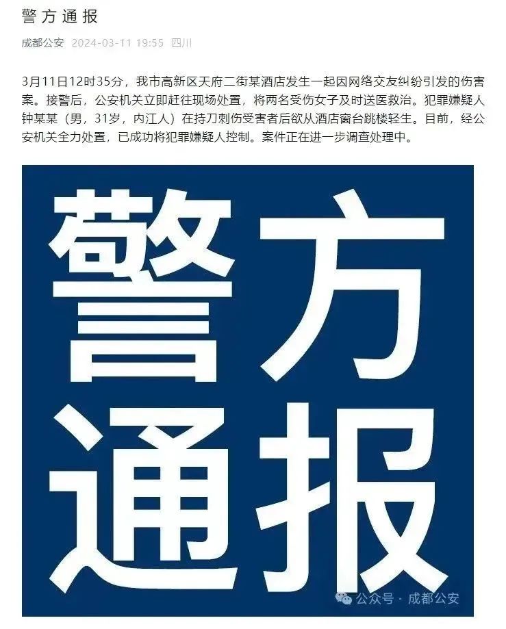 对此,成都公安于3月11日通过微信公众号发布“警方通报”称,成都市高新区天府二街某酒店发生一起因网络交友纠纷引发的伤害案。接警后,公安机关立即赶往现场处置,将两名受伤女子及时送医救治。犯罪嫌疑人钟某某(男,31岁,内江人)在持刀刺伤受害者后欲从酒店窗台跳楼轻生。目前,经公安机关全力处置,已成功将犯罪嫌疑人控制。案件正在进一步调查处理中。