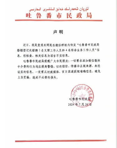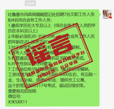 经新疆吐鲁番市民政局查证,该单位近期并未向社会公布招聘信息,相关信息属不实信息。
