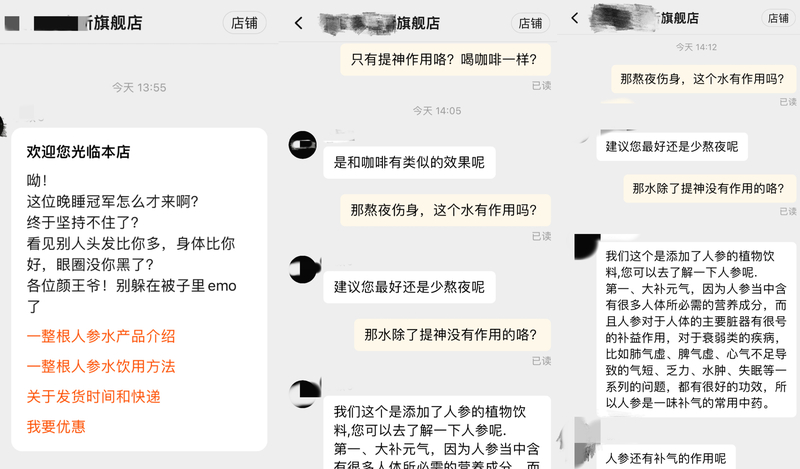 记者以普通消费者身份向旗舰店客服咨询,发现了一些端倪。例如,品牌店默认打招呼的表述是“呦!这位晚睡冠军怎么才来啊?”被询问产品“对熬夜有什么作用”时,客服罗列了一串人参的功效,并表示可以“提神”。被询问“熬夜伤身,这个水有作用吗”时,客服建议少熬夜,然后又罗列了一串人参的功效,表示“人参补气”,却不正面回答。