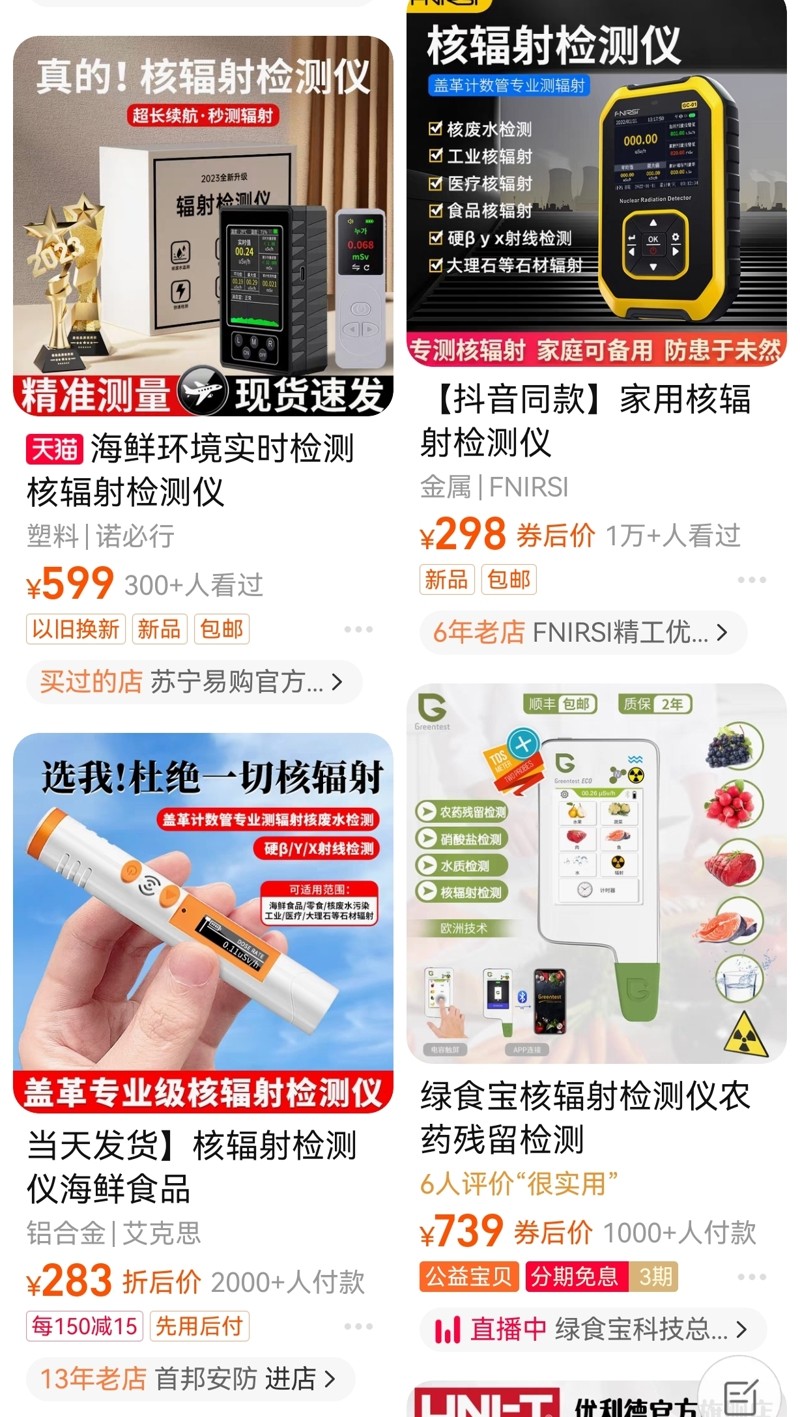 近期,“核辐射检测仪”也成为热销产品,价格大都为几百元。从产品说明看,这类便携式检测仪适用于物体表面或空气、水中的放射性检测。但网上售卖的便携式放射性检测仪性能局限较大,并不能检测出核污染水中的放射性核素。因此,它们并非万能的检测仪。