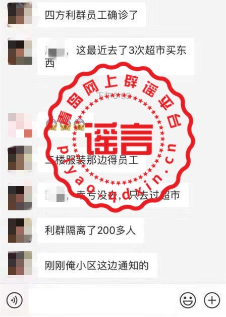 2月13日,“四方利群二楼服装员工确诊,利群隔离了200多人”的信息在部分网友的社交圈内流传。利群集团对此发布声明称,上述信息不实。此类谣传信息极易产生恐慌情绪,号召大家坚决抵制。
