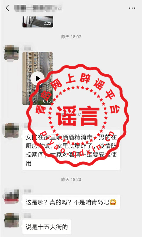 谣言五:青岛十五大街居民喷酒精消毒引爆燃