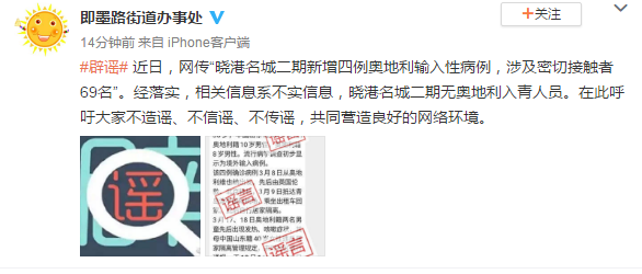 3月31日,网传“晓港名城二期新增四例奥地利输入性病例,涉及密切接触者69名”。随后,即墨路街道办事处官方微博发布辟谣称,经落实,相关信息系不实信息,晓港名城二期无奥地利入青人员。