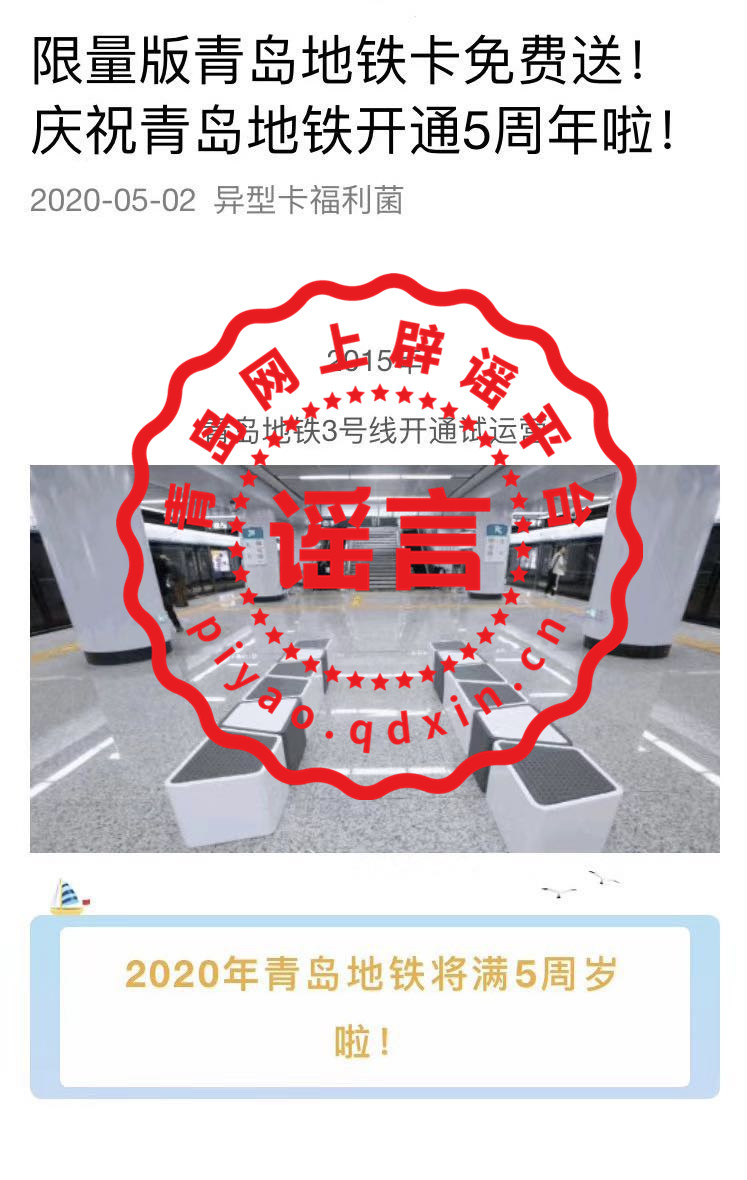 5月2日,微信朋友圈、微博出现大量转发“限量版青岛地铁卡免费送!庆祝青岛地铁开通5周年啦!”的文章。仔细辨别可发现,这是一个无法查看公众号信息的“伪装”页面;其次,按照正文引导,最终会进入一个假的公众号。青岛地铁也随即辟谣,该活动非青岛地铁官方举办。