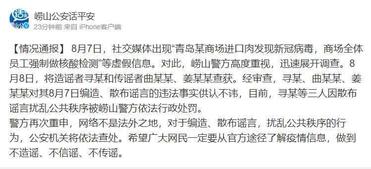 8月7日,社交媒体出现“青岛某商场进口肉发现新冠病毒,商场全体员工强制做核酸检测”等虚假信息。8月8日,崂山警方将造谣者寻某和传谣者曲某某、姜某某查获。经审查,寻某、曲某某、姜某某对其8月7日编造、散布谣言的违法事实供认不讳,寻某等三人因散布谣言扰乱公共秩序被崂山警方依法行政处罚。