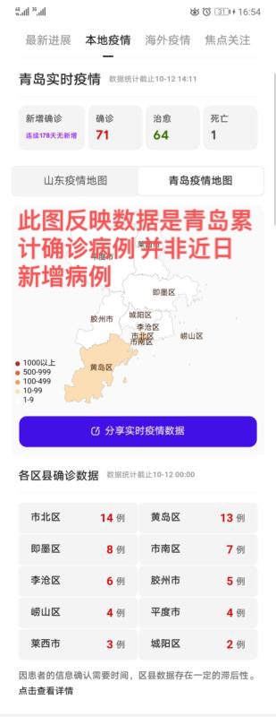 10月12日,朋友圈热传的两张图表引发误解,图片“确诊”一栏显示的“71”让很多人认为是此次青岛疫情的数据。经查证,此截图反映的是自2020年1月份疫情发生以来至今,青岛累计确诊病例,并非近日新增病例。