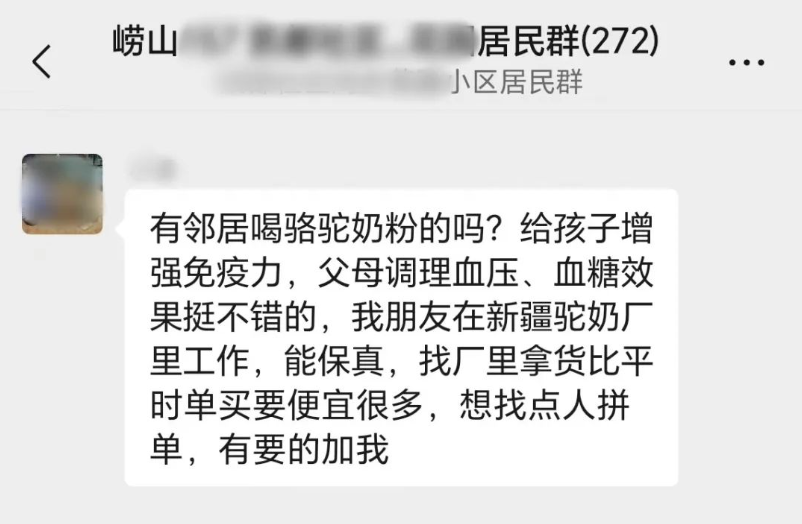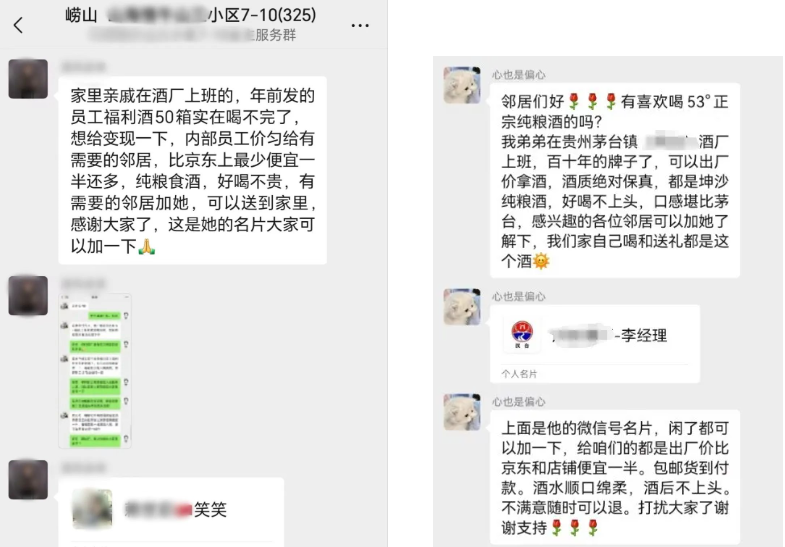 据了解,近期多个业主群出现“帮妹妹、弟弟处理酒”“拼单驼奶粉”等信息。虽然销售主体有所不同,但套路基本相同,都是换汤不换药。