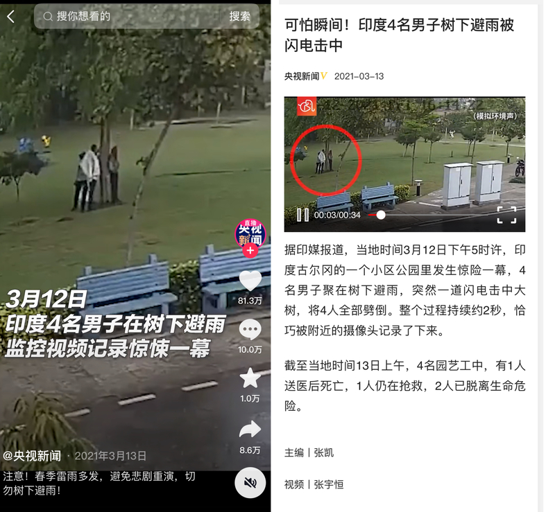 经核查,在国内媒体中较早发布该视频的是央视新闻相关账号。央视新闻发布时,明确在画面上标注了“3月12日印度4名男子在树下避雨,监控视频记录惊悚一幕”的摘要,并提醒“春季雷雨多发,避免悲剧重演,切勿树下避雨”。