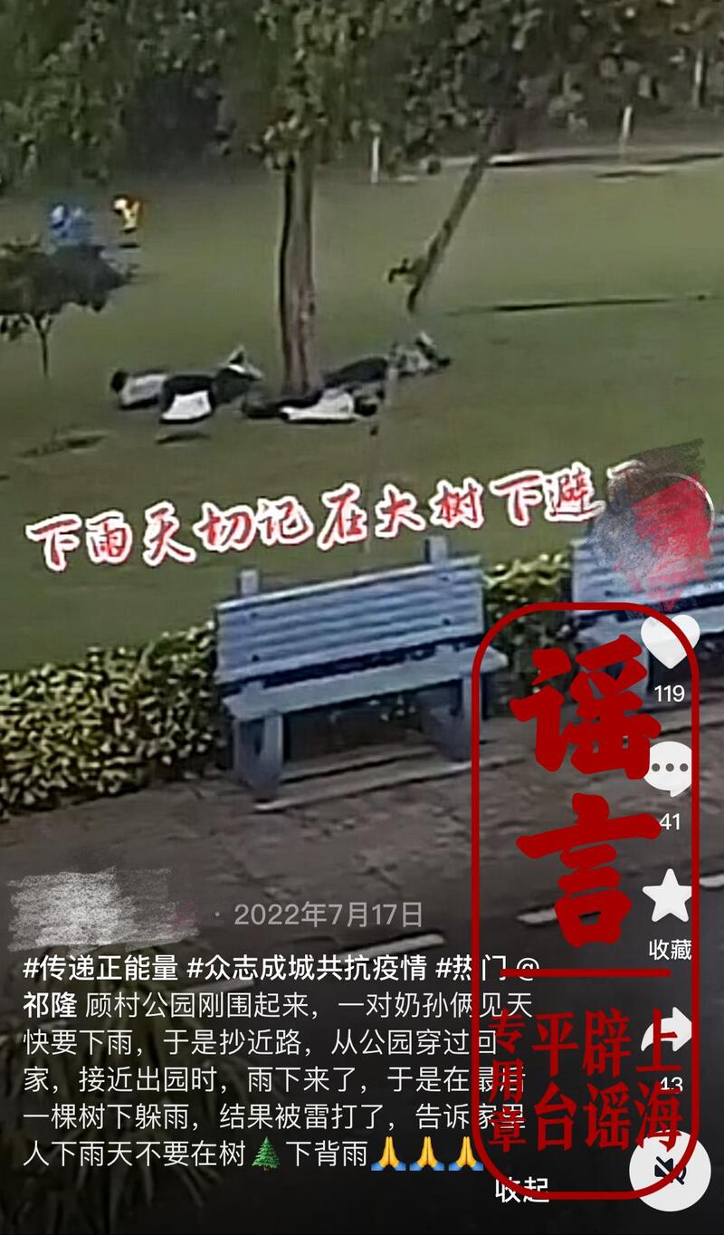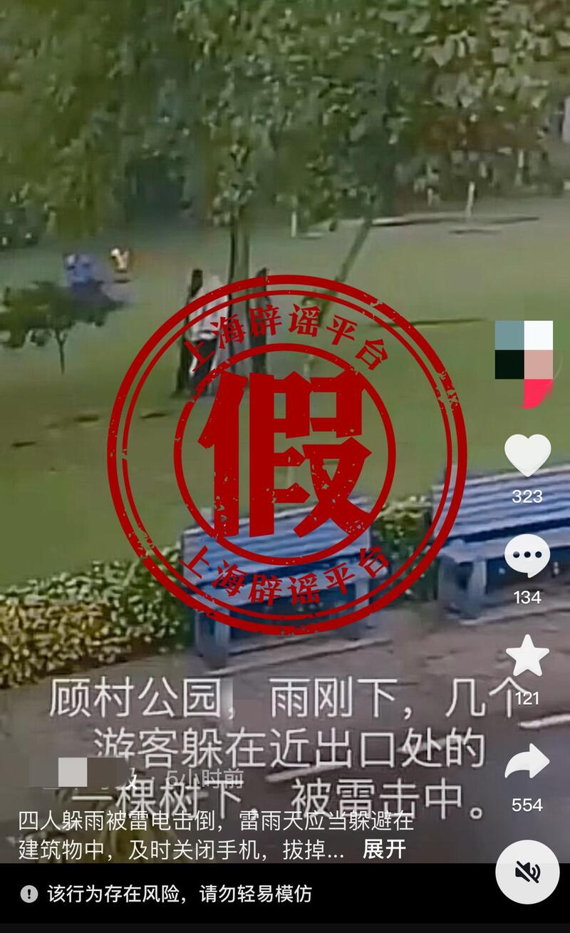 上海辟谣平台调查发现,部分账号在转载央视新闻的视频时,掐头去尾,隐去了时间和发生地点;更有好事者不分青红皂白,在画面上增加了“顾村公园”的标记,甚至有人编造了“顾村公园里一对奶孙抄近路在树下躲雨被雷打了”等虚假情节。