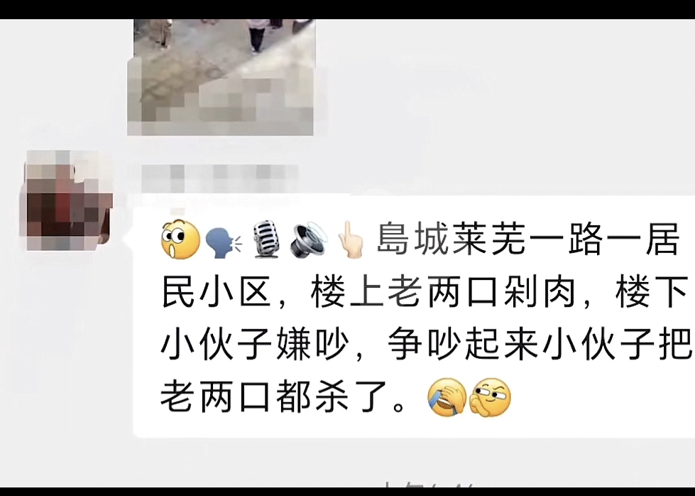 8月7日,一段视频在青岛市民的微信群中广泛传播,视频下方另配有文字:“莱芜一路一居民小区,楼上两口子剁肉,楼下小伙子嫌吵,争吵起来小伙子把老两口都杀了。”