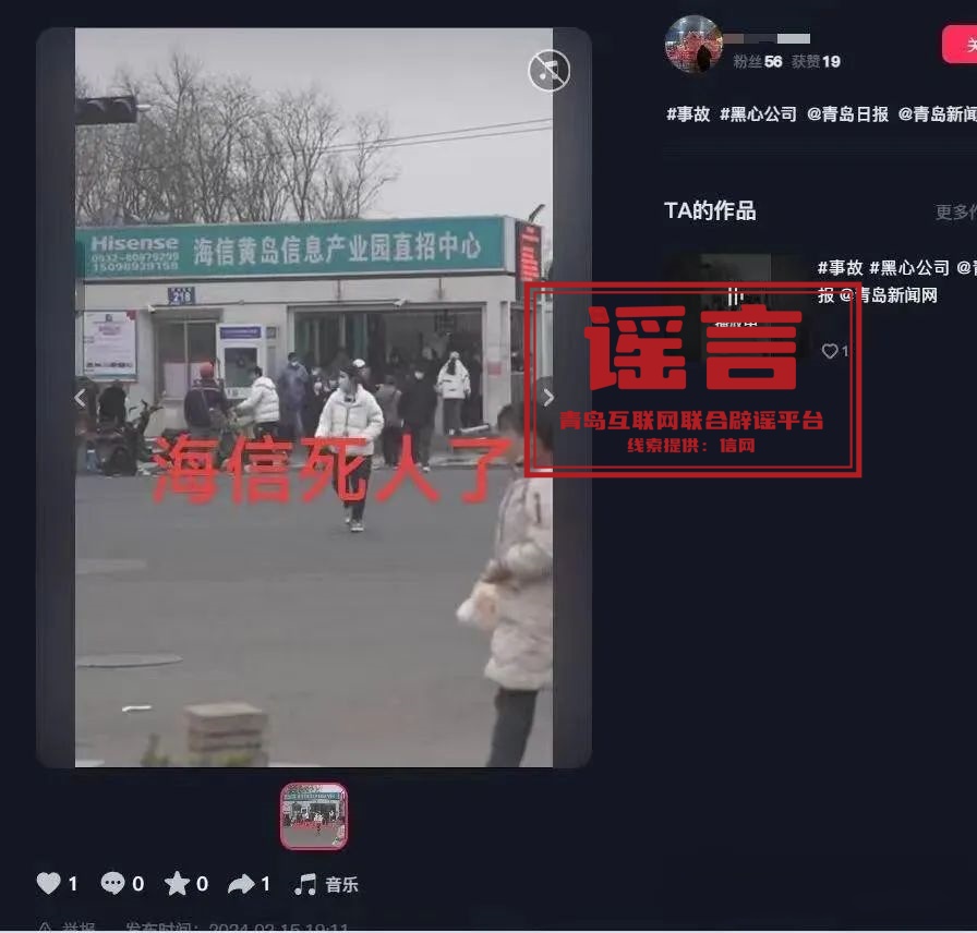 信网4月10日讯 据青岛网警微信公众号最新消息,一网民在抖音平台发布一张背景为开发区海信黄岛信息产业园直招中心的照片,并配文称“海信死人了”。经向企业工作人员核实,近期海信没有类似情况发生,该网民发布的信息属于虚假信息,对企业形象造成不良影响。