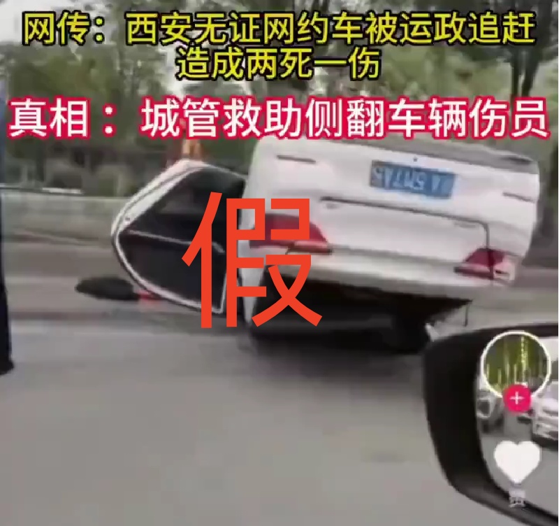 真实情况为,沣东新城综合行政执法支队工作人员路过天章大道时看见一辆白色小轿车侧翻路边,有人员被困,及时拨打救助电话,并与现场群众展开救援时,一出租车司机路过并将拍摄的原视频发至微信群聊中。该视频后被微信群中的其他人加工编造出“运政追车、两死一伤”并发布网络,带来了极大的不良影响。目前,造谣者已被已被传唤至公安机关,依法行政拘留。