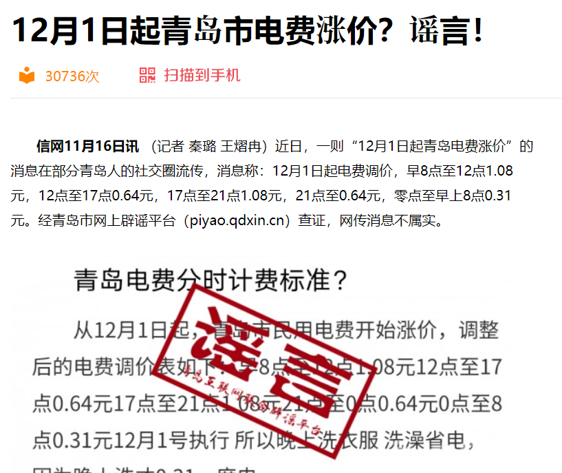 2023年11月,青岛市网上辟谣平台就“12月1日青岛市电费涨价”进行辟谣,可见老谣言换汤不换药。时间由12月1日改变为6月1日,电费涨价内容都毫无变化,移花接木到其他城市,又成了一则新谣言。