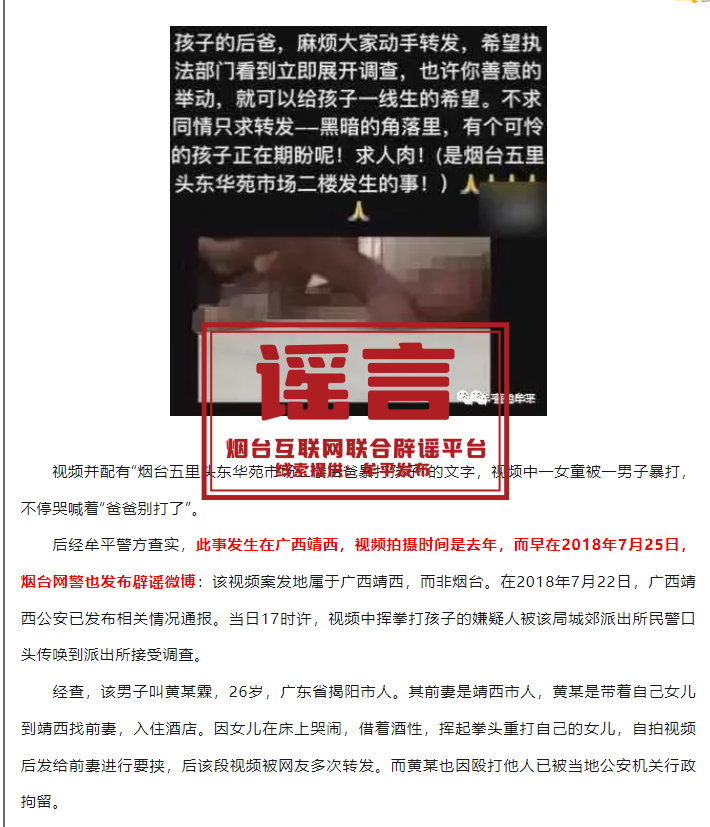 早在2019年,牟平公安就已发布过辟谣信息:该视频案发地属于广西靖西,2018年7月22日,广西靖西公安已发布相关情况通报,视频中男子叫黄某某,因女儿在床上哭闹,借着酒性,其挥拳重打自己的女儿,自拍视频后发给前妻进行要挟,后该段视频被网友多次转发。而黄某某也因殴打他人被当地公安机关行政拘留。