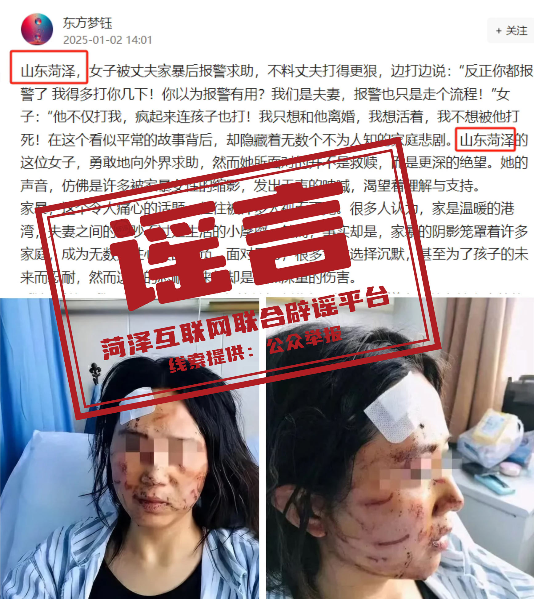 2025年1月2日14时许,网民“东方梦钰”在自媒体平台发布帖文称“山东菏泽,女子被丈夫家暴……”,配图中女子伤势严重,该帖文多次提到事发地为山东菏泽。
