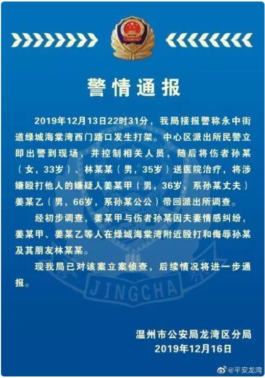 随后经网络检索发现,该事件是2019年发生在浙江温州,当时温州市公安局龙湾区分局已立案侦查并发布警情通报。