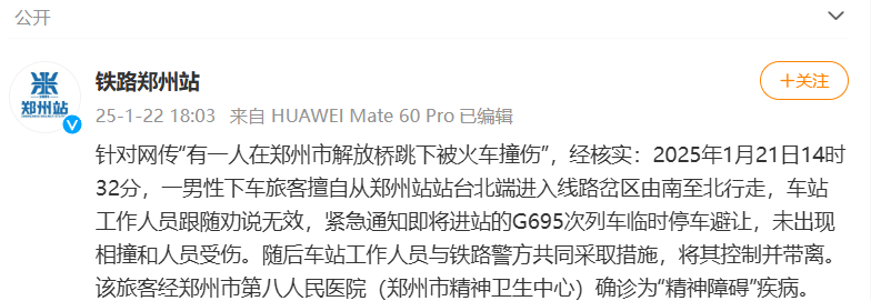 经核实:2025年1月21日14时32分,一男性下车旅客擅自从郑州站站台北端进入线路岔区由南至北行走,车站工作人员跟随劝说无效,紧急通知即将进站的G695次列车临时停车避让,未出现相撞和人员受伤。随后车站工作人员与铁路警方共同采取措施,将其控制并带离。该旅客经郑州市第八人民医院(郑州市精神卫生中心)确诊为“精神障碍”疾病。(信网记者)
